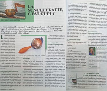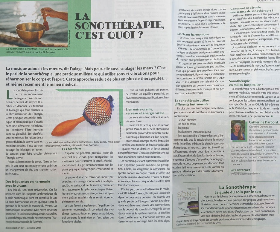 Article sur Catherine Dabord, pionnière française de la sonothérapie, paru en octobre 2025 dans le magasine Biocontact.
