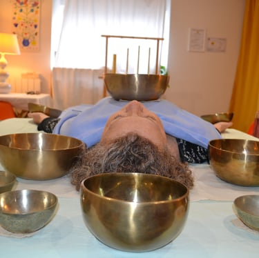 En fonction du ou des blocages à résoudre, je choisis les bols adaptés à votre situations et je les places autour de votre corps ou dessus, sur des zones précises, ainsi qu'autour de votre tête. Je frappe les bols très doucement ou je les fais chanter afin d'obtenir les résultats désirés.